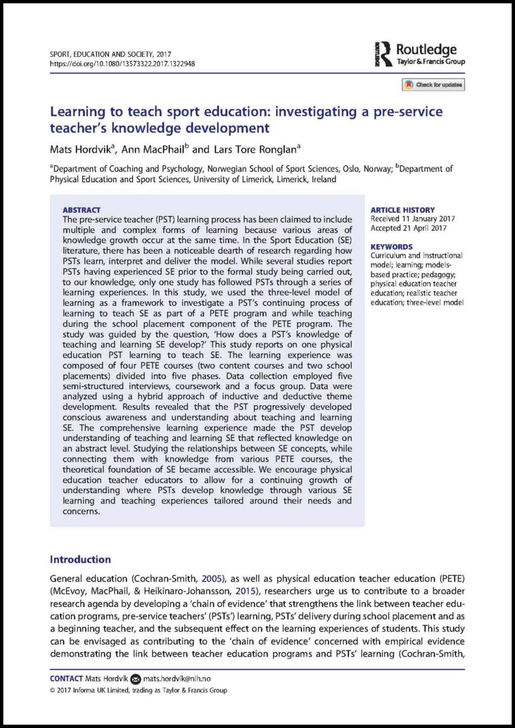 Hordvik, M., MacPhail, A. & Tore Ronglan, L. (2017): Learning to teach sport education: investigating a pre-service teacher’s knowledge development, Sport, Education and Society. DOI: 10.1080/13573322.2017.1322948