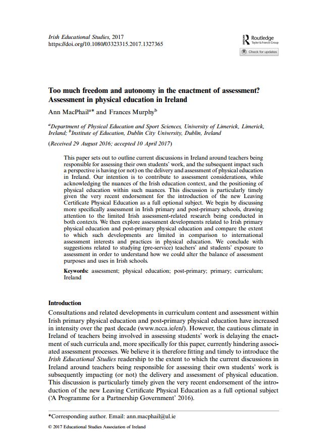 MacPhail, A. & Murphy, F. (2017). Too much freedom and autonomy in the enactment of assessment? Assessment in physical education in Ireland, Irish Educational Studies, DOI: 10.1080/03323315.2017.1327365