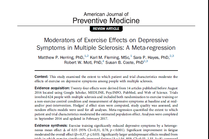 Herring MP, Fleming KM, Hayes SP, Motl RW, Coote SB. Moderators of exercise effects on depressive symptoms in Multiple Sclerosis: A meta-regression. Am J Prev Med. 2017; https://doi.org/10.1016/j.amepre.2017.04.011