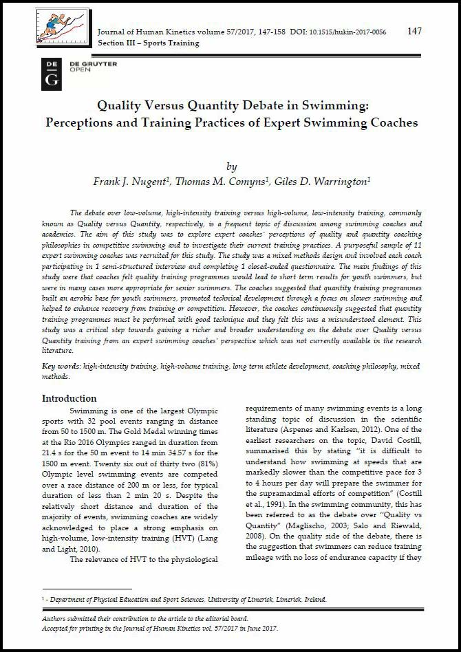 Nugent, F.J., Comyns, T.M. and Warrington, G.D. Quality Versus Quantity Debate in Swimming: Perceptions and Training Practices of Expert Swimming Coaches. Journal of Human Kinetics volume 57/2017, 147-158 DOI: 10.1515/hukin-2017-0056