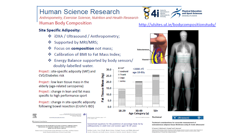 Using the latest technologies to measure accurately whole body and regional distribution of fat and lean tissue mass and the University and local community as representative of the Irish population we have conducted a survey of body composition and presented these findings stratified by age and sex. These data underpin future intervention studies designed to reduce obesity and other health risks related to aberrant body composition in the Irish population. We have also applied the same technology to assist in the development of optimal body composition, fat and lean mass, for a wide range of high performance athletes, Senior County GAA and Irish and Munster Rugby players. Recognising the paradoxical rise in the incidence of poor bone health of female athletes researchers are also exploring why this occurs and what can be done to prevent it.