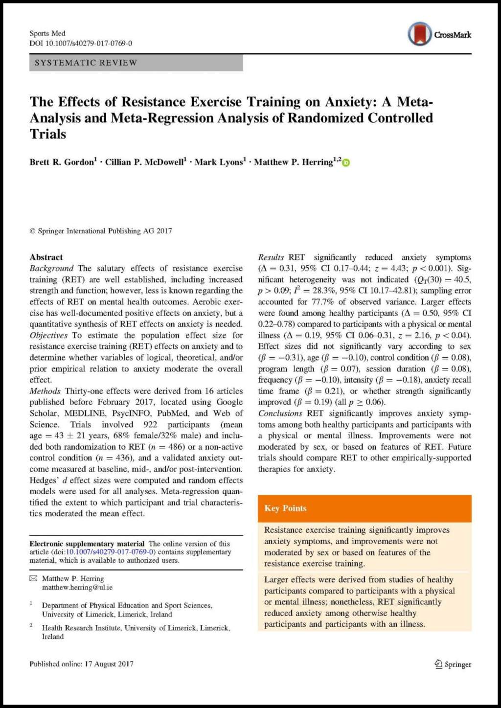 Link to Full Publication: Gordon, B.R., McDowell, C.P., Lyons, M. and Herring, M.P. The Effects of Resistance Exercise Training on Anxiety: A Meta-Analysis and Meta-Regression Analysis of Randomized Controlled Trials. Published online 17 August 2017. Sports Medicine, pp 1-12 DOI: 10.1007/s40279-017-0769-0