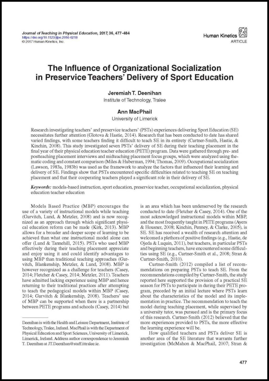 Deenihan, J.T. & MacPhail, A. (2017) The Influence of Organizational Socialization in Pre-Service Teachers’ Delivery of Sport Education. Journal of Teaching in Physical Education, 36, 477-484. doi/10.1123/jtpe.2016-0218
