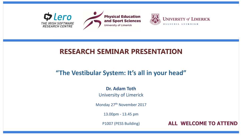In this seminar, Dr. Toth will discuss the role that inner ear information has in areas of cognitive neuroscience, biomechanics, neurophysiology, clinical therapies and sport sciences. Galvanic vestibular stimulation, a sophisticated technique used to explore the role of inner ear feedback in these numerous areas will also be highlighted in the seminar.