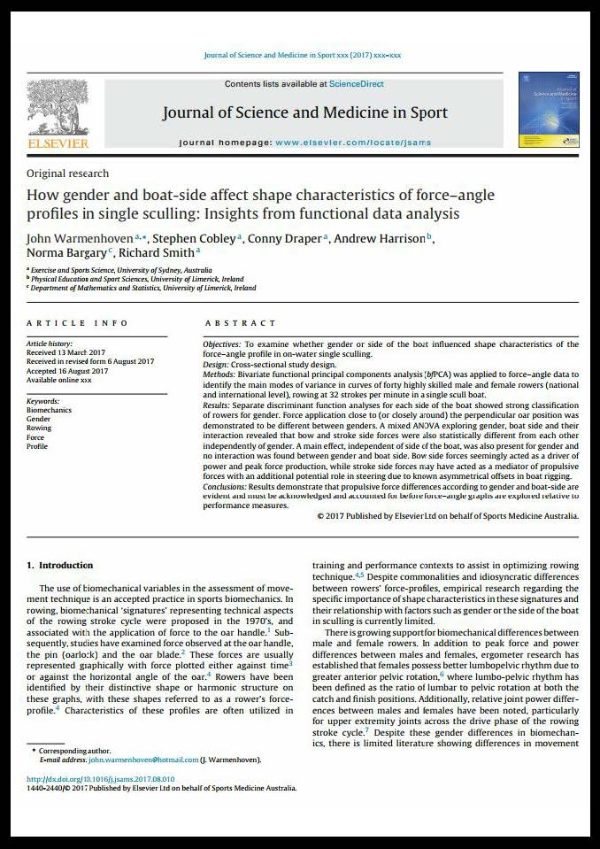 Warmenhoven, J., Cobley,S., Draper, C., Harrison, A.J., Bargary, N. & Smith, R.M. (2017) How gender and boat side effect shape characteristics of force-angle profiles in single sculling: Insights from functional data analysis. Journal of Science and Medicine in Sport, pp. 1-5. http://dx.doi.org/10.1016/j.jsams.2017.08.010 Published online 24 August 2017