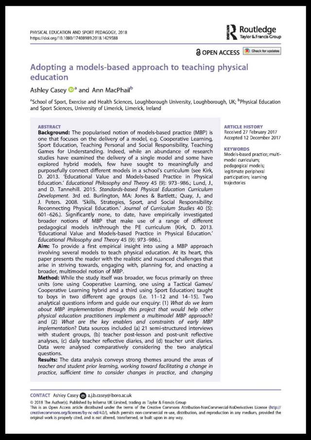 Research Impact: This paper provides a first empirical insight into using a models-based practice approach involving several models to teach physical education. At its heart, this paper presents the reader with the realistic and nuanced challenges […]