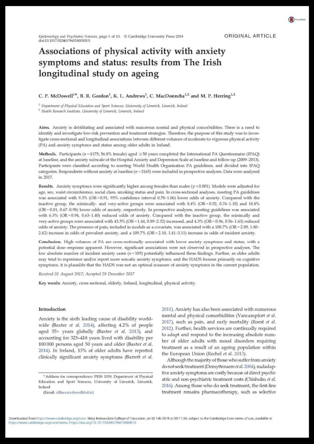 McDowell CP, Gordon BR, Andrews KL, MacDonncha C, Herring MP. Associations of physical activity with anxiety symptoms and status: results from The Irish longitudinal study on ageing. Epidemiology and Psychiatric Sciences, 2018 doi: 10.1017/S204579601800001X.