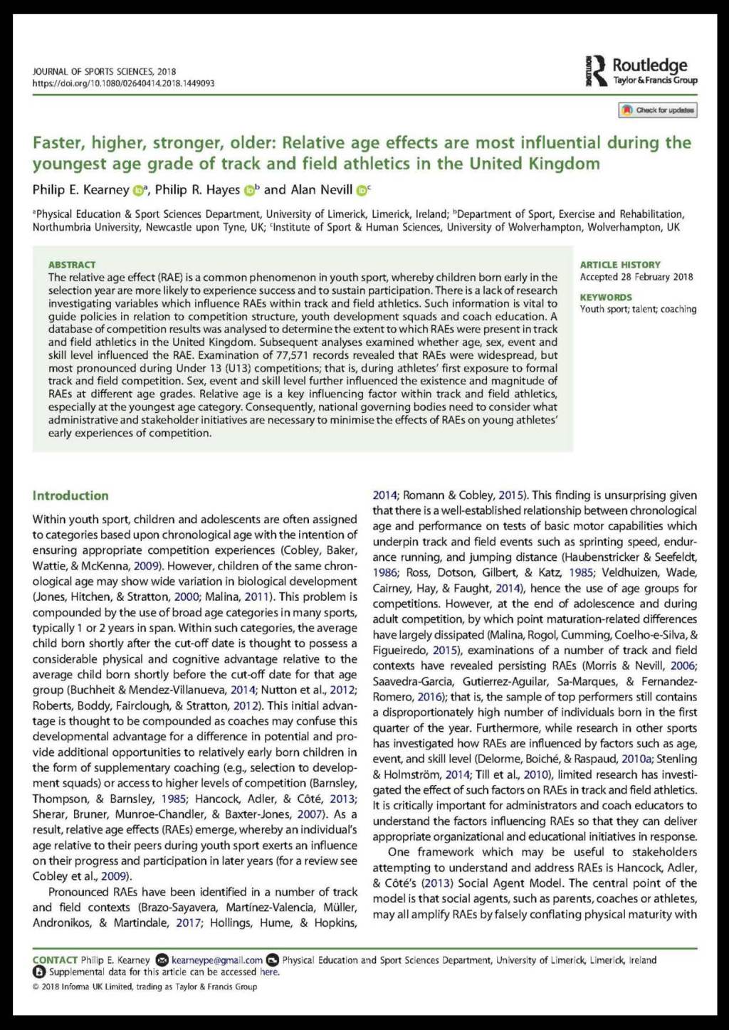 Kearney, P.E., Hayes, P.R. and Nevill, A., 2018. Faster, higher, stronger, older: Relative age effects are most influential during the youngest age grade of track and field athletics in the United Kingdom. Journal of Sports Sciences, pp.17. https://doi.org/10.1080/02640414.2018.1449093