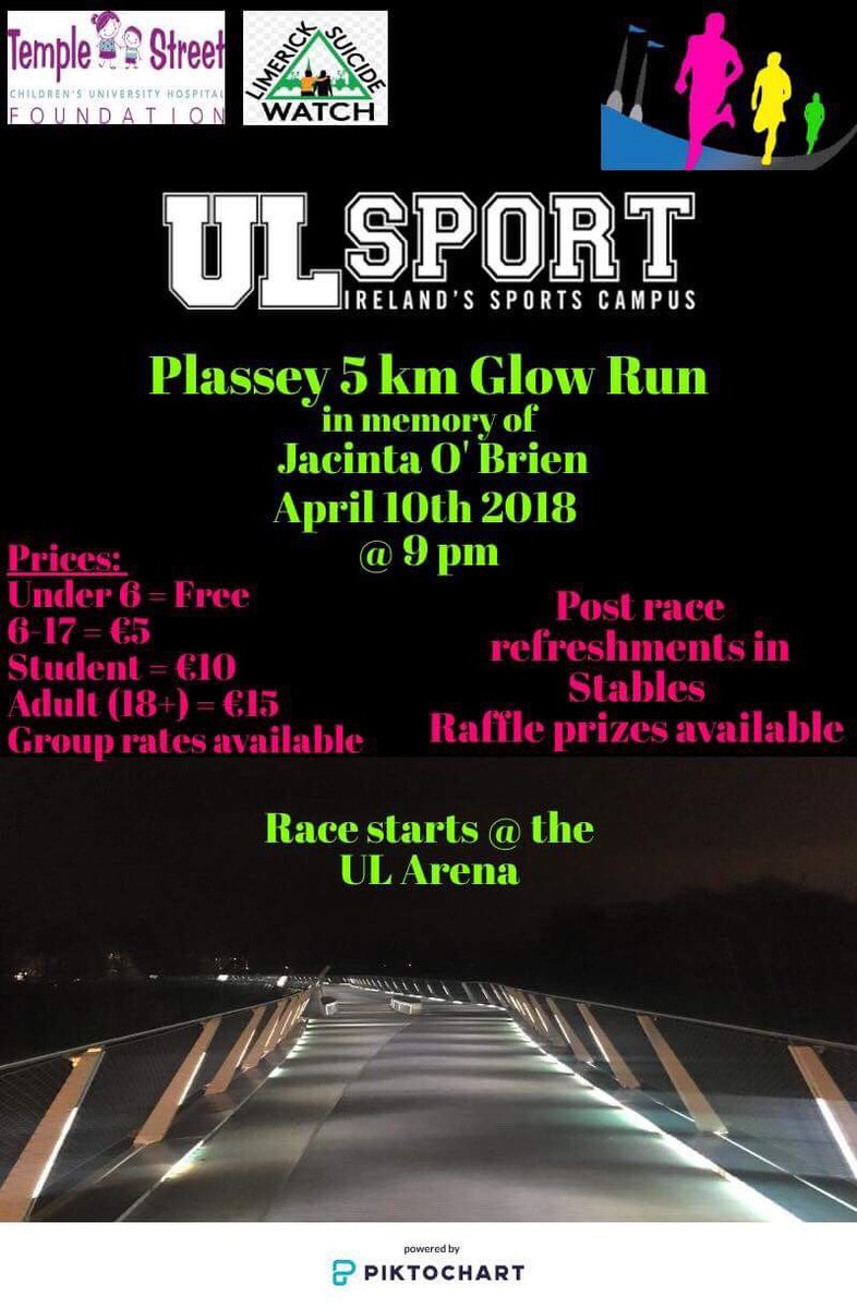 A 5k Glow Run will be held in memory of Jacinta O’Brien, a former member of the Physical Education and Sport Sciences Department in UL who sadly passed away from SADS (Sudden Adult Death Syndrome) in 2004. Jacinta completely immersed herself in the UL community, in sport and within the PESS faculty. In remembrance of her passing, each year a charity run is organised by the 2nd year Sport and Exercise Science students.