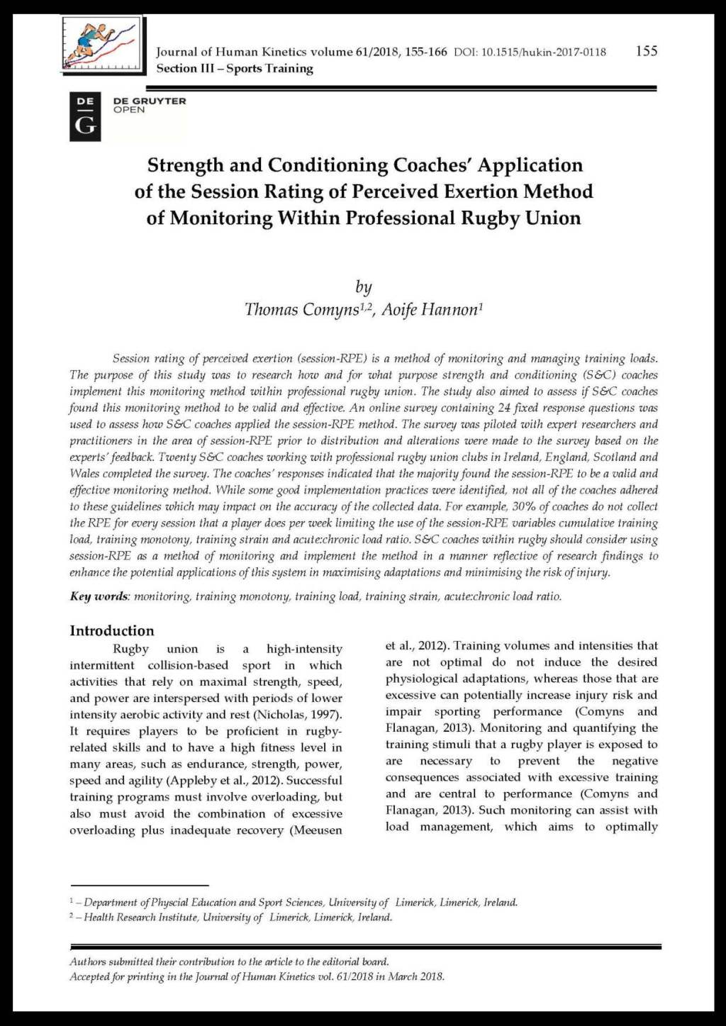 Comyns, T. & Hannon, A. Strength and conditioning coaches’ application of the session rating of perceived exertion method of monitoring within professional rugby union. Journal of Human Kinetics volume 61/2018, 155-166 DOI: 10.1515/hukin-2017-0118