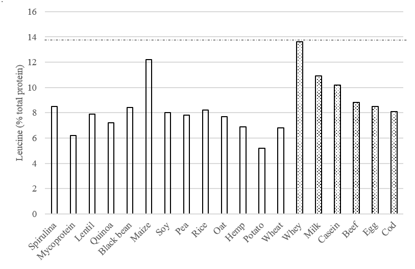 Cognisant of the role of EAAs, BCAAs and leucine in regulating MPS, an examination of relative EAA and leucine content in both traditional and novel protein sources is necessary. van Vliet et al. (2015) reviewed skeletal muscle anabolic responses to plant-versus animal-based protein consumption (Figure 2 EAA and leucine content (as % of total protein) for proposed alternatives. In order that an alternative be consider a viable substitute for dairy based proteins in support of muscle mass accrual with resistance training, it should have a high relative EAA and leucine content. With the exception of quinoa, soy and hemp, plant sources of protein will always be limited when considered in isolation, as plant protein sources are deficient in one or more amino acids, usually methionine or lysine (e.g. wheat is low in lysine yet high in methionine, whereas lentil is high in lysine, yet low in methionine). This is referred to as the limiting / absent EAA. These plant based protein sources also contain lower quantities of leucine.
