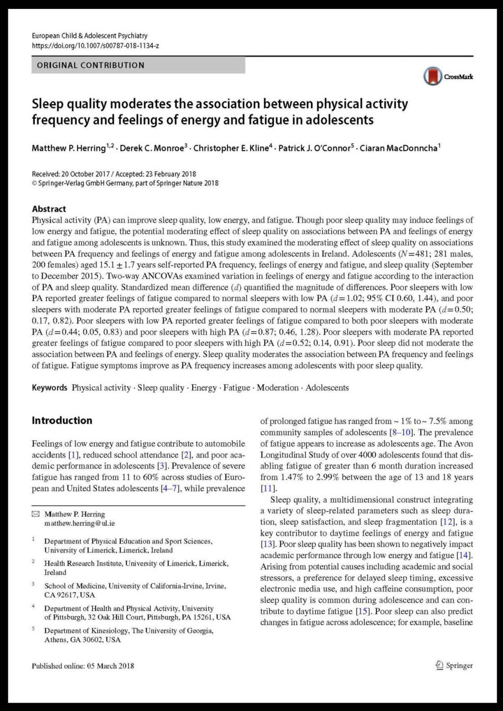 Herring MP, Monroe DC, Kline CE, O’Connor PJ, MacDonncha C (2018). Sleep quality moderates the association between physical activity frequency and feelings of energy and fatigue in adolescents. European Child & Adolescent Psychiatry. doi: 10.1007/s00787-018-1134-z. (IF: 3.295; C=0; Q1 Pediatrics; R=12/121)*