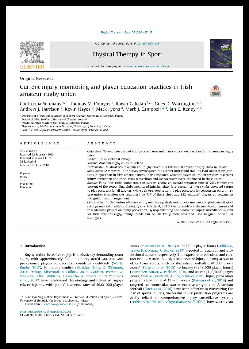 Yeomans, C., Comyns, T.M., Cahalan, R., Warrington, G.D., Harrison, A.J., Hayes, K., Lyons, M., Campbell, M.J. and Kenny, I.C., 2018. Current injury monitoring and player education practices in Irish amateur rugby union. Physical Therapy in Sport. doi: 10.1016/j.ptsp.2018.06.008