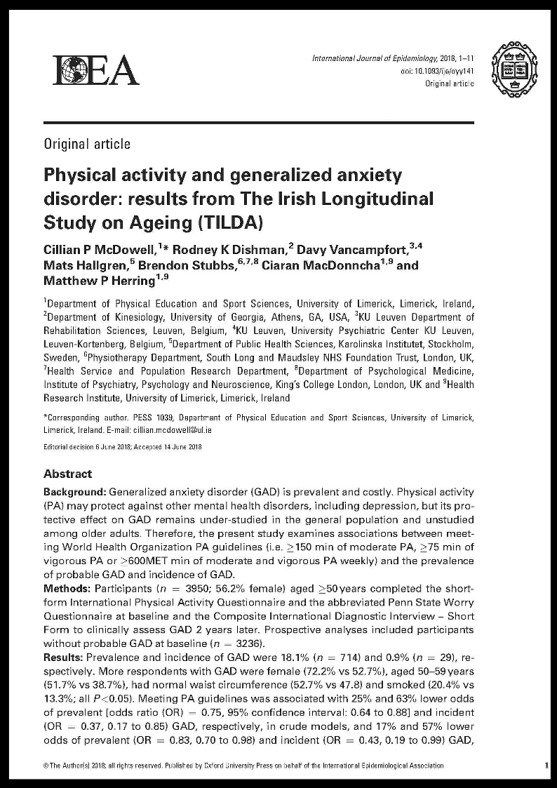 McDowell CP, Dishman RK, Vancampfort D, Hallgren M, Stubbs B, MacDonncha C, Herring MP (2018) Physical Activity and Generalized Anxiety Disorder: Results from The Irish Longitudinal Study on Ageing (TILDA). International Journal of Epidemiology doi: 10.1093/ije/dyy141 (IF:8.36; Q1: Public, Environmental & Occupational Health – SCIE)