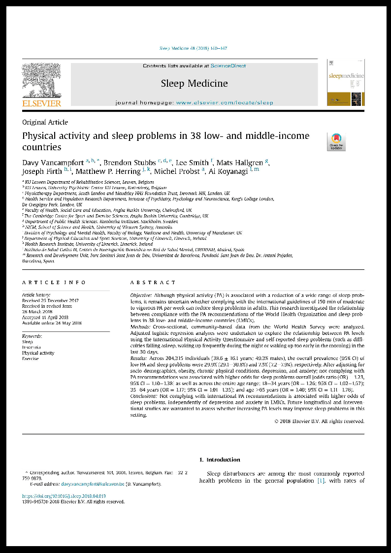 Vancampfort D, Stubbs B, Smith L, Hallgren M, Firth J, Herring MP, Probst M, Koyanagi A (2018). Physical activity and sleep problems in 38 low- and middle-income countries. Sleep Medicine, 48:140-147. doi: 10.1016/j.sleep.2018.04.013. (IF: 3.395; Q2 Clinical Neurology; R=64/197)