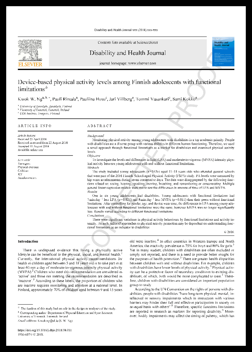 Ng K.W., Rintala, P, Husu, P., Villberg, J., Vasankari, R and Kokko, S. 2018. Device-based physical activity levels among Finnish adolescents with functional limitations. Disability and Health Journal. In Press https://www.sciencedirect.com/science/article/pii/S1936657418301869
