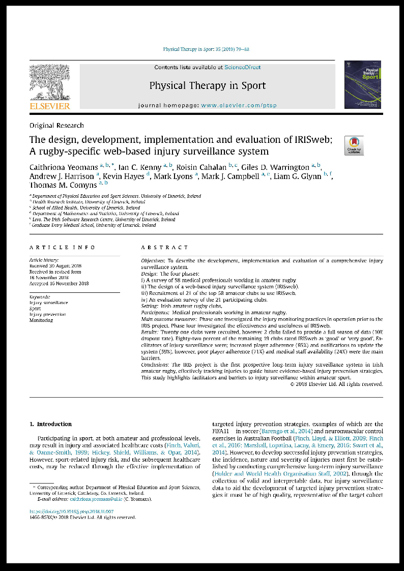 Yeomans, C., Kenny, I.C., Cahalan, R., Warrington, G.D., Harrison, A.J., Hayes, K., Lyons, M., Campbell, M.J., Glynn, L.G. and Comyns, T.M., 2018. The design, development, implementation and evaluation of IRISweb; A rugby-specific web-based injury surveillance system. Physical Therapy in Sport. DOI: 10.1016/j.ptsp.2018.11.007