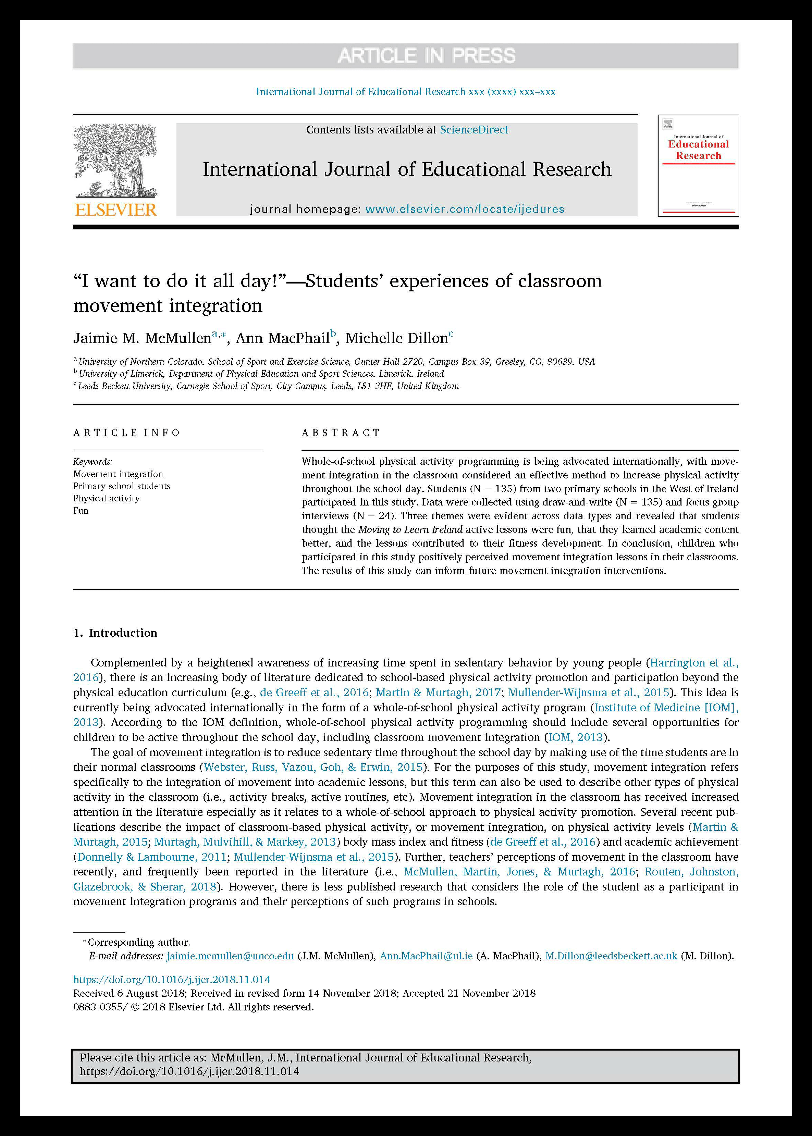McMullen, J., MacPhail, A. & Dillon, M. (2018) “I want to do it all day!” – Students’ experiences of classroom movement integration. International Journal of Educational Research. doi.org/10.1016/j.ijer.2018.11.014