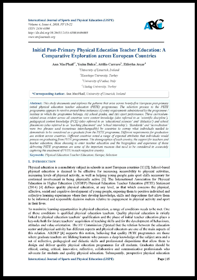 MacPhail, A., Bulca, Y., Carraro, A. & Avşar, Z. (2018) Initial post-primary physical education teacher education: a comparative exploration across European countries. International Journal of Sports and Physical Education, 4(4), 15-21. doi: 10.20431/2454-6380.0404003