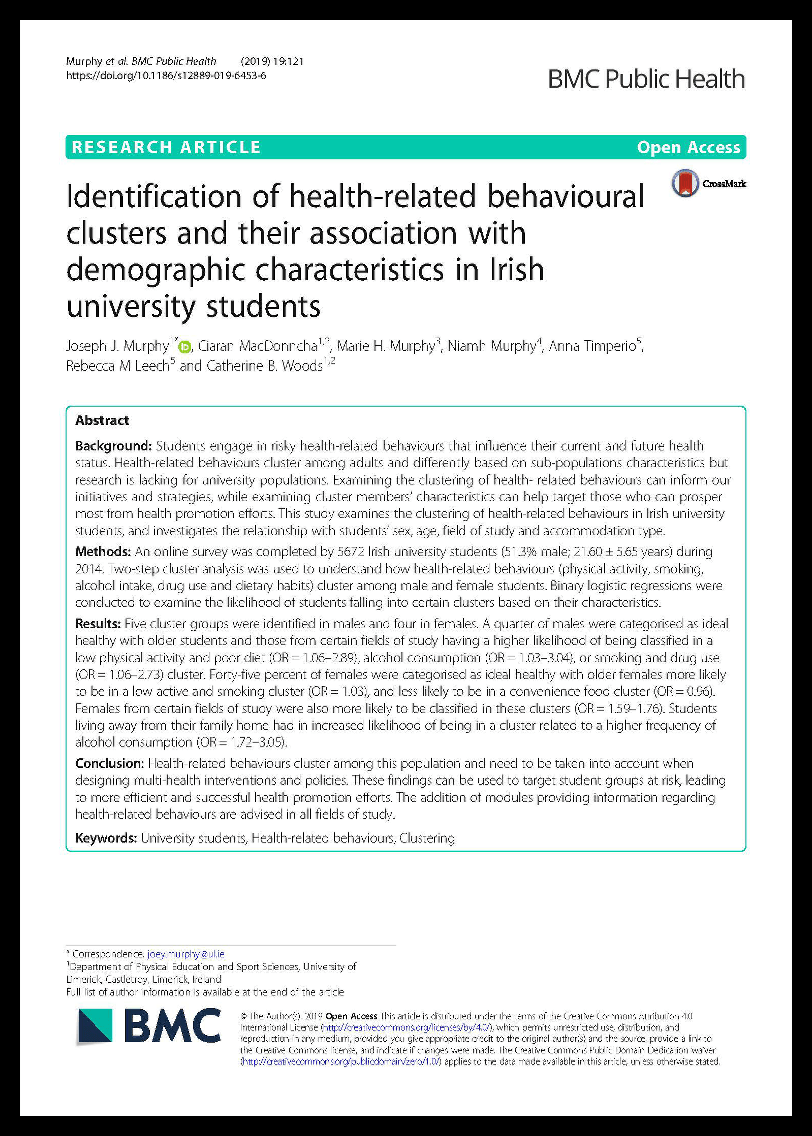 Murphy, J.J., MacDonncha, C., Murphy, M.H., Murphy, N., Timperio, A., Leech, R.M., & Woods, C.B. Identification of health-related behavioural clusters and their association with demographic characteristics in Irish university students. BMC Public Health 2019 19:121. DOI: