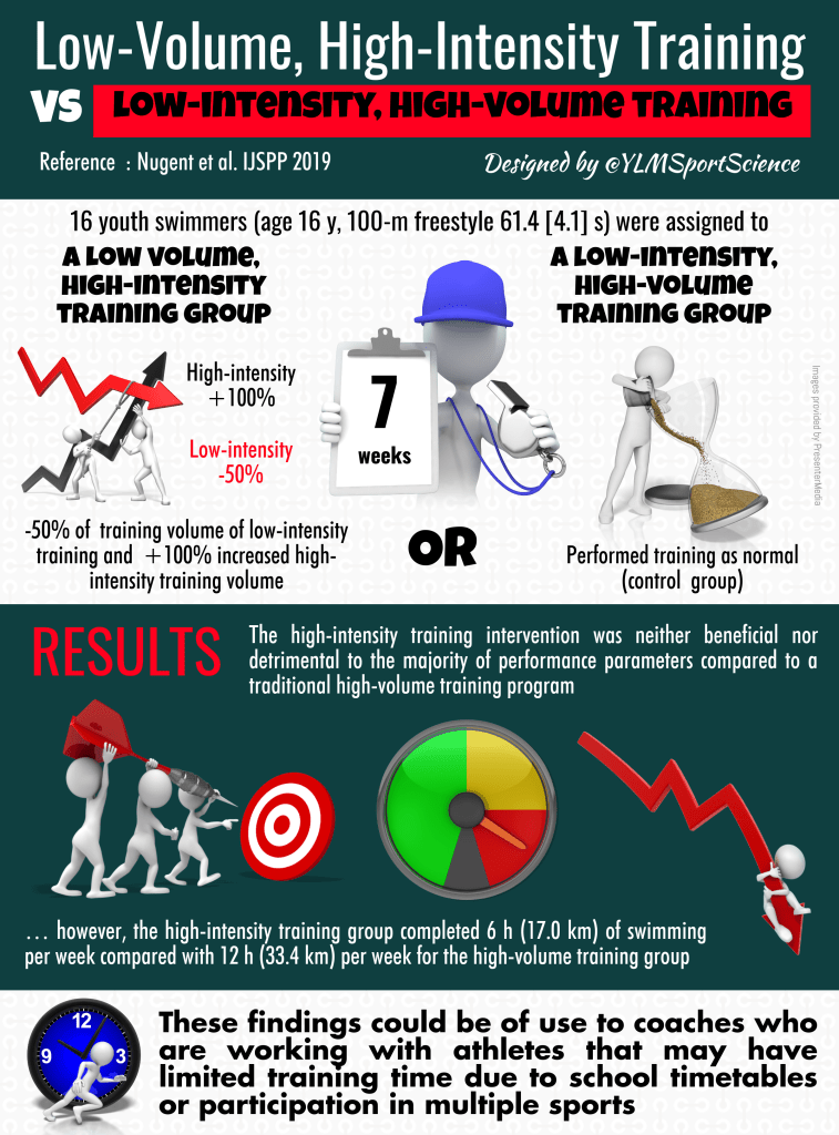 Nugent, F., Comyns, T., Nevill, A. and Warrington, G.D., 2019. The Effects of Low-Volume, High-Intensity Training on Performance Parameters in Competitive Youth Swimmers. International journal of sports physiology and performance, 14(2), pp.203-208. DOI: 10.1123/ijspp.2018-0110