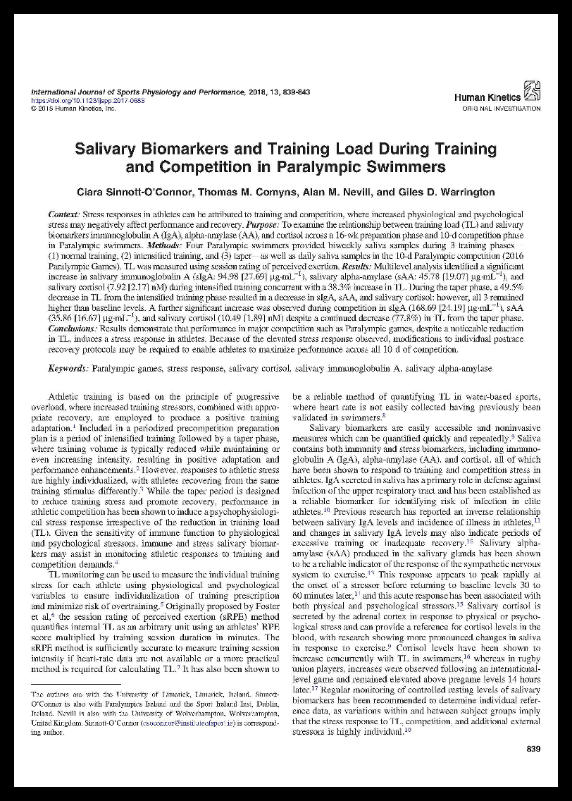 Sinnott-O’Connor, C., Comyns, T.M., Nevill, A.M. and Warrington, G.D., 2018. Salivary Biomarkers and Training Load During Training and Competition in Paralympic Swimmers. International journal of sports physiology and performance, 13(7), pp.839-843. DOI: 10.1123/ijspp.2017-0683