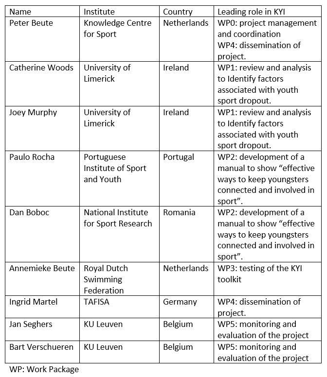 Keep Youngsters Involved consists of eight partners of the European Erasmus+Sport Programme (co-funded by the European Union) aiming to find answers to the question: ‘How can we prevent youngsters (age 12-19) from dropout from sport?’ Through a rapid review, the 14 most important factors to prevent dropout were identified. These factors became the base of a variety of practical tools and materials, suitable for use by sport professionals and volunteers (trainers, coaches) who work with youngsters all over the world.