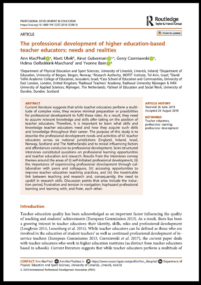 MacPhail, A, Ulvik, M., Guberman, A. Czerniawski, G., Oolbekkink-Marchand, H., & Bain, Y. (2019). The professional development of higher education-based teacher educators: needs and realities, Professional Development in Education, 45:5, 848-861, DOI: 10.1080/19415257.2018.1529610