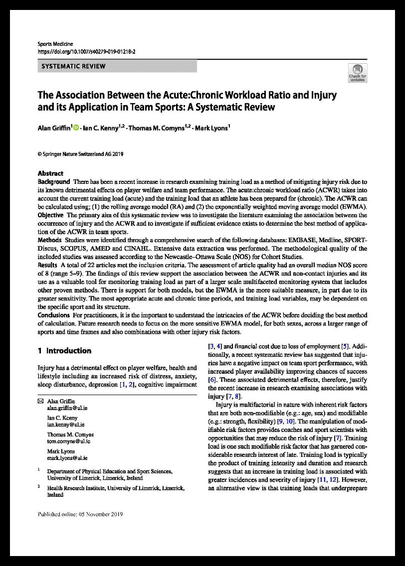 Griffin, A., Kenny, I. C., Comyns, T. M., & Lyons, M. (2019). The Association Between the Acute: Chronic Workload Ratio and Injury and its Application in Team Sports: A Systematic Review. Sports Medicine. doi:10.1007/s40279-019-01218-2 (IF 7.867, Q1, 3/81)