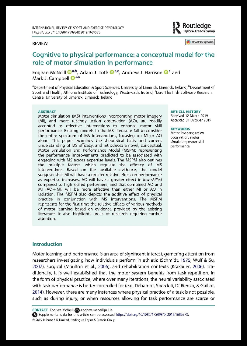 McNeill, E., Toth, A.J., Harrison A.J., & Campbell, M.J. (2019) Cognitive to physical performance: a conceptual model for the role of motor simulation in performance, International Review of Sport and Exercise Psychology, DOI: 10.1080/1750984X.2019.1689573 Q1 Top 10% IF 6.9