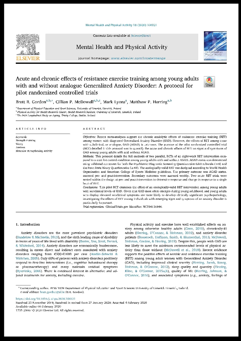 Gordon BR, McDowell CP, Lyons M, Herring, MP (2020). Acute and chronic effects of resistance exercise training among young adults with and without analogue generalized anxiety disorder: a protocol for pilot randomized controlled trials. Mental Health and Physical Activity. (IF: 1.798; Q3: Psychiatry-SCIE). https://doi.org/10.1016/j.mhpa.2020.100321
