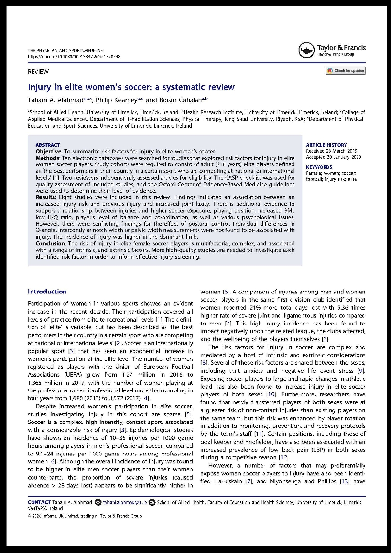 Alahmad, T.A., Kearney, P. and Cahalan, R., 2020. Injury in elite women’s soccer: a systematic review. The Physician and Sportsmedicine, pp.1-7. DOI: 10.1080/00913847.2020.1720548