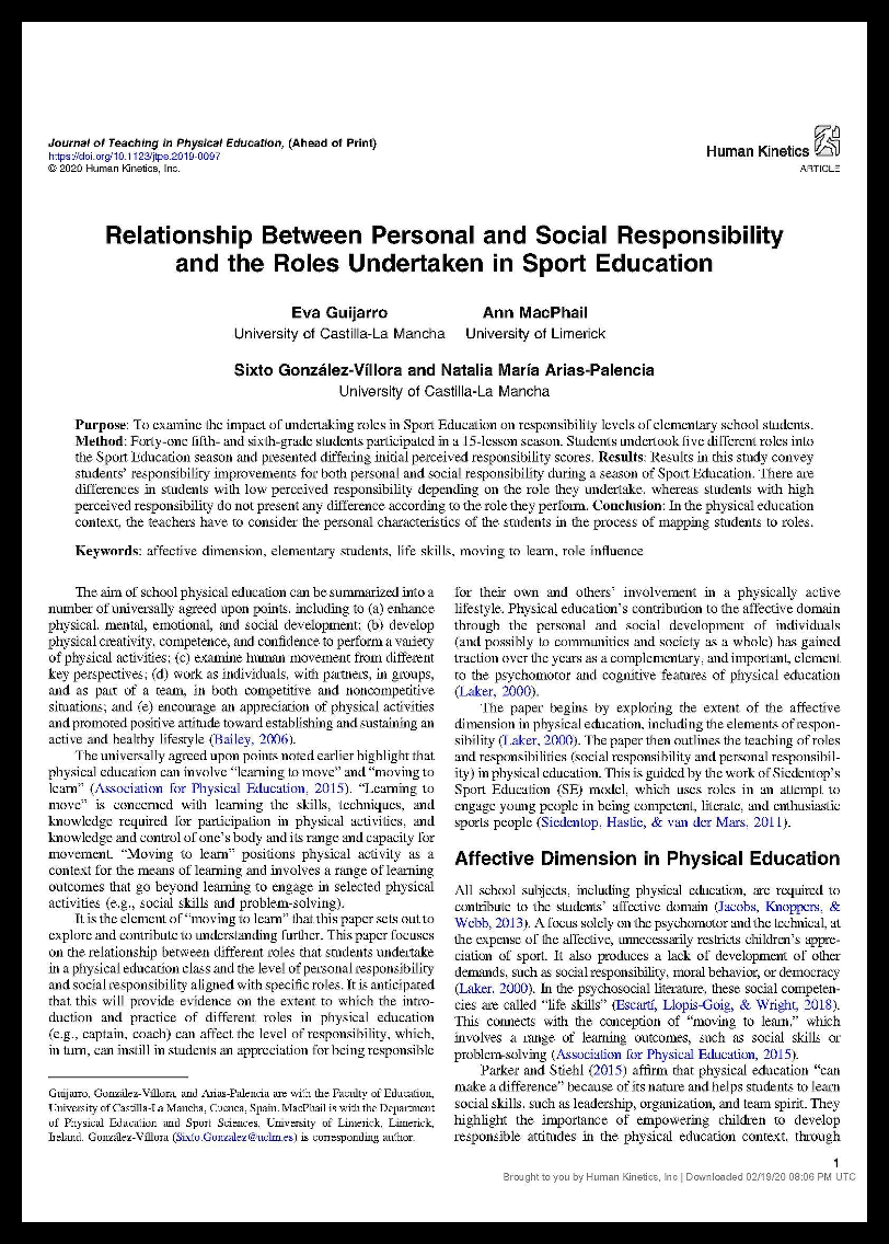 Guijarro, E., MacPhail, A., Gonzalez-Villora, S. & Arias-Palencia, N.M. (2020) Responsibility and the roles undertaken in Sport Education, Journal of Teaching in Physical Education, https://doi.org/10.1123/jtpe.2019-0097