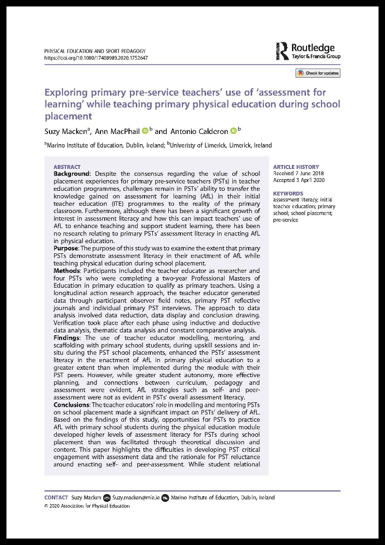 Macken, S., MacPhail, A., & Calderón, A. (2020). Exploring primary pre-service teachers’ use of ‘assessment for learning’ while teaching primary physical education during school placement. Physical Education and Sport Pedagogy. doi:10.1080/17408989.2020.1752647