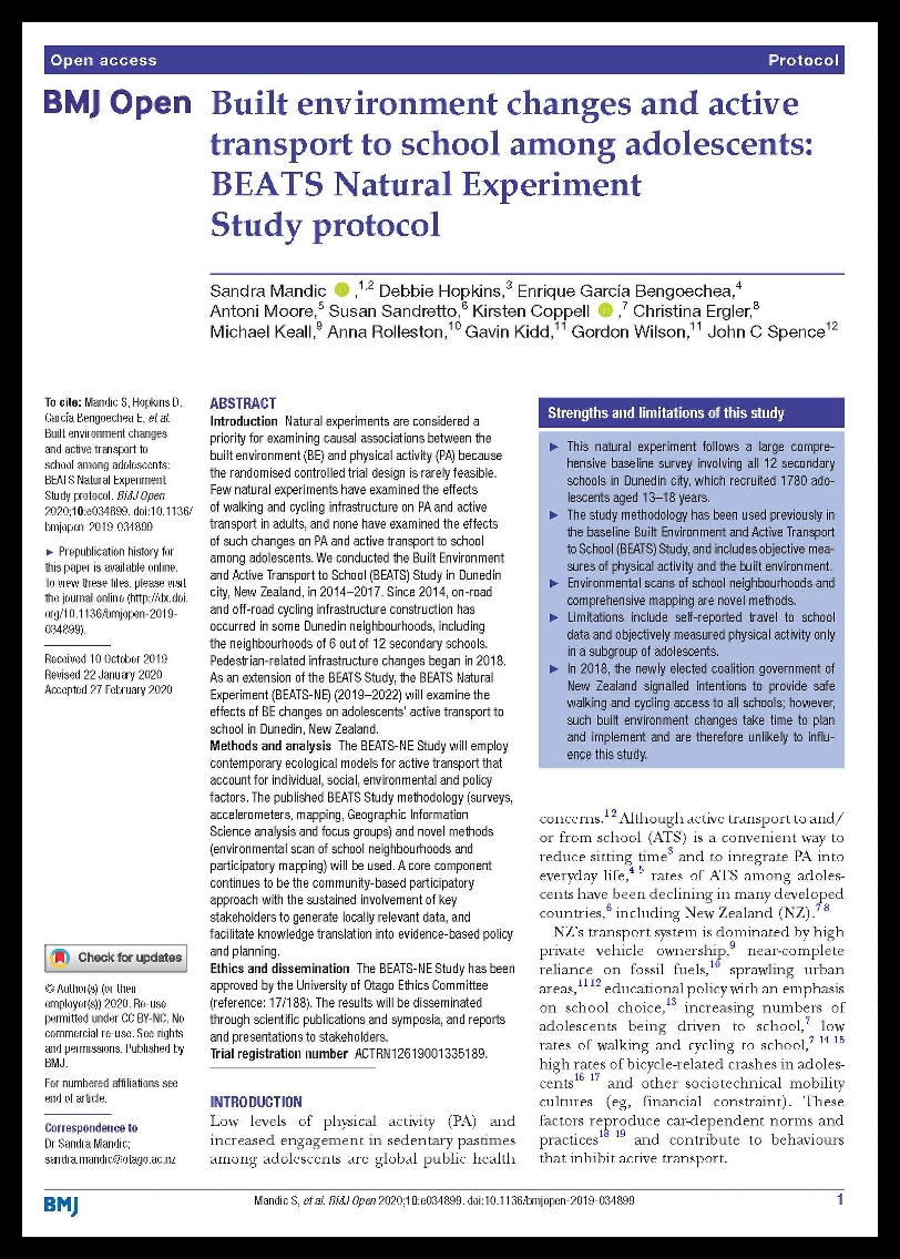 Mandic, S., Hopkins, D., Bengoechea, E.G., Moore, A., Sandretto, S., Coppell, K., Ergler, K., Keall, M., Rolleston, A., Kidd, G., Wilson, G. & Spence, J.C. (2020). Built Environment Changes and Active Transport to School among Adolescents: BEATS Natural Experiment Study Protocol. BMJ Open, 10:e034899. doi:10.1136/bmjopen-2019-034899