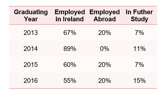 The MSc Sports Performance programme started in 2012 and has graduated over 144 students in this period (average of 24 per year). The data available from the First Destinations Survey (supported by the Higher Education Authority) for that 2013 graduating class up to and including the 2016 graduating class are as follows