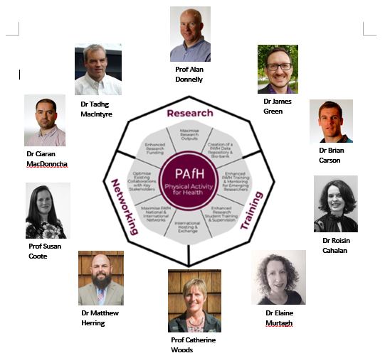 The PAfH cluster is funded by the Health Research Institute (HRI) in UL and has recently celebrated its 1st birthday (April 2020). The cluster aims to build a national and international hub of excellence in the area of physical activity (PA) and health research by bringing together a multidisciplinary group of physiologists, sports and exercise scientists, physiotherapists, and health, sports and exercise psychologists. The cluster is led by Prof Alan Donnelly, associate professor in exercise physiology, alongside 9 colleagues across departments/disciplines in UL (see image below).