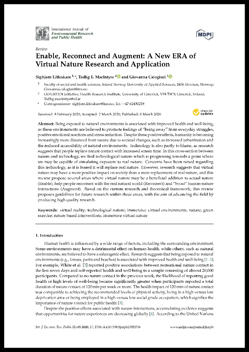 Litleskare, S.; E. MacIntyre, T.; Calogiuri, G. Enable, Reconnect and Augment: A New ERA of Virtual Nature Research and Application. Int. J. Environ. Res. Public Health 2020, 17, 1738. https://www.mdpi.com/journal/ijerph/special_issues/advances_green_exercise_health_promotion
