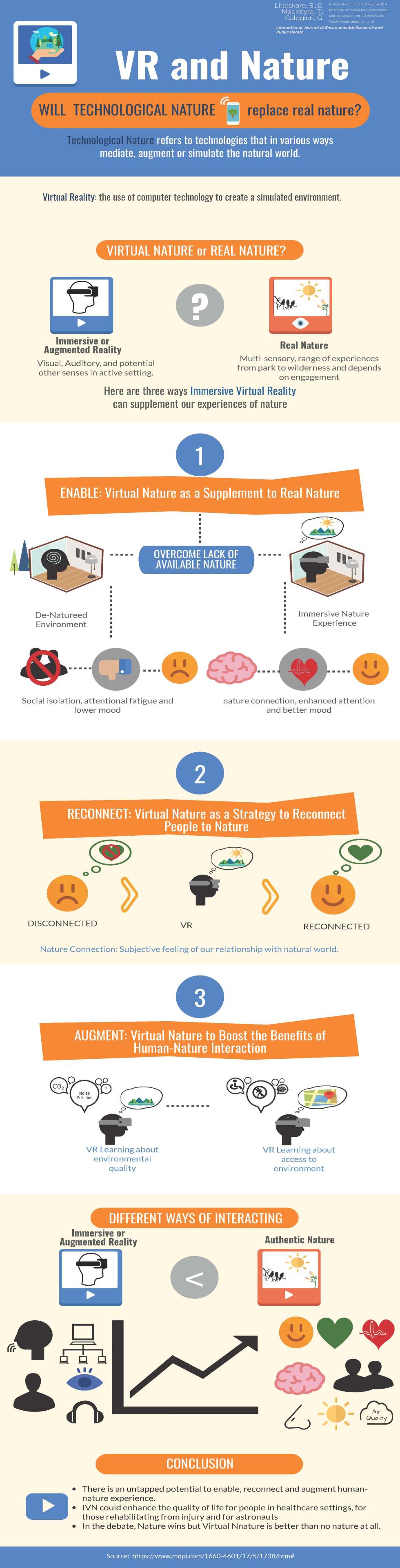 Research Impact: Technology is paradoxically increasing our connection to nature, at least during COVID19 restrictions when we cannot all physically get to nature. Photo sharing of green spaces for example have been inked to higher levels of well-being. Technological nature, digital simulations of nature, are progressing towards a point where we may be capable of simulating exposure to real nature. Concerns have been raised regarding this technology, as it is feared it will replace real nature. However, research suggests that virtual nature may have a more positive impact on society than a mere replacement of real nature, and this review propose several areas where virtual nature may be a beneficial addition to actual nature (Enable), help people reconnect with the real natural world (Reconnect) and “boost” human-nature interactions (Augment). Based on the current research and theoretical framework, this review proposes guidelines for future research within these areas, with the aim of advancing the field by producing high quality research.