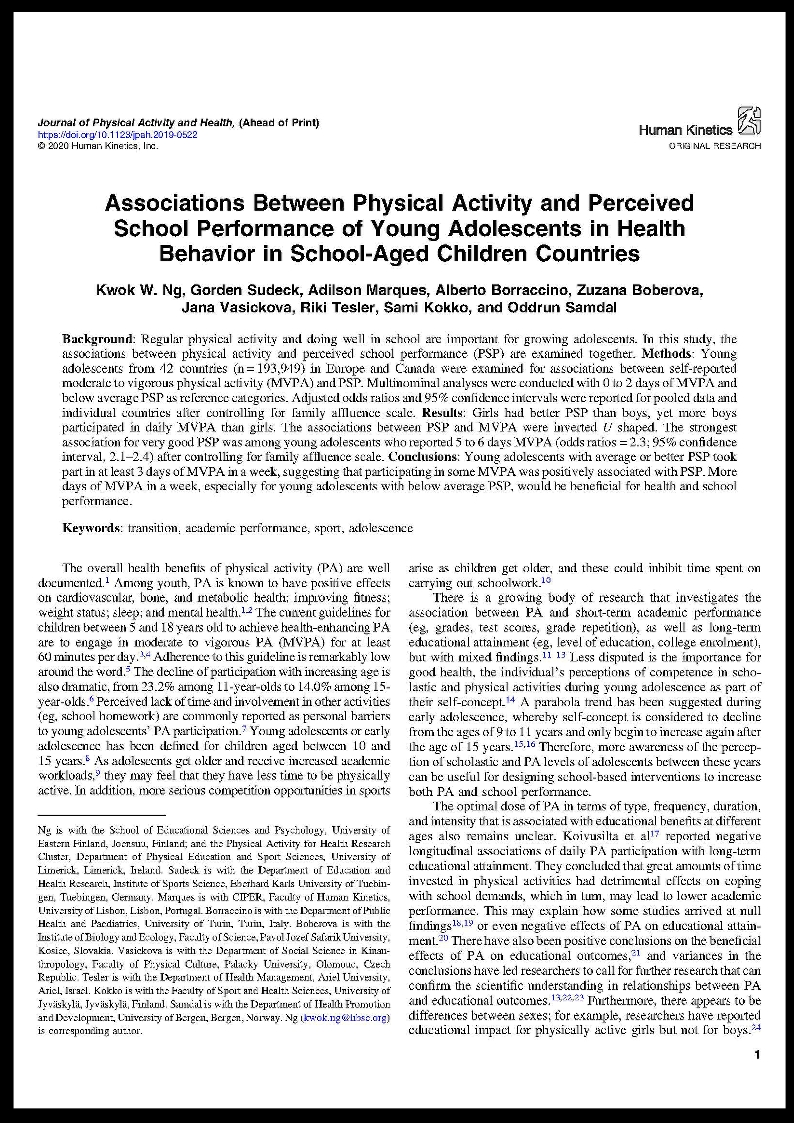 Ng, K. W., Sudeck, G., Marques, A., Borraccino, A., Boberova, Z., Vasickova, J., Tesler, R., Kokko, S., & Samdal, O. (2020). Associations Between Physical Activity and Perceived School Performance of Young Adolescents in Health Behavior in School-Aged Children Countries, Journal of Physical Activity and Health, , 1-11. DOI:10.1123/jpah.2019-0522