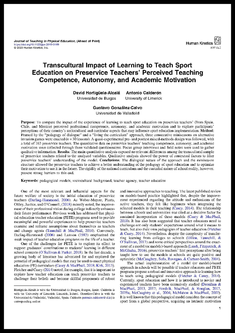 Hortigüela-Alcalá, D., Calderón, A., & González-Calvo, G. (2020). Transcultural impact of learning to teach sport education on preservice teachers’ perceived teaching competence, autonomy, and academic motivation. Journal of Teaching in Physical Education. doi:10.1123/jtpe.2019-0169.