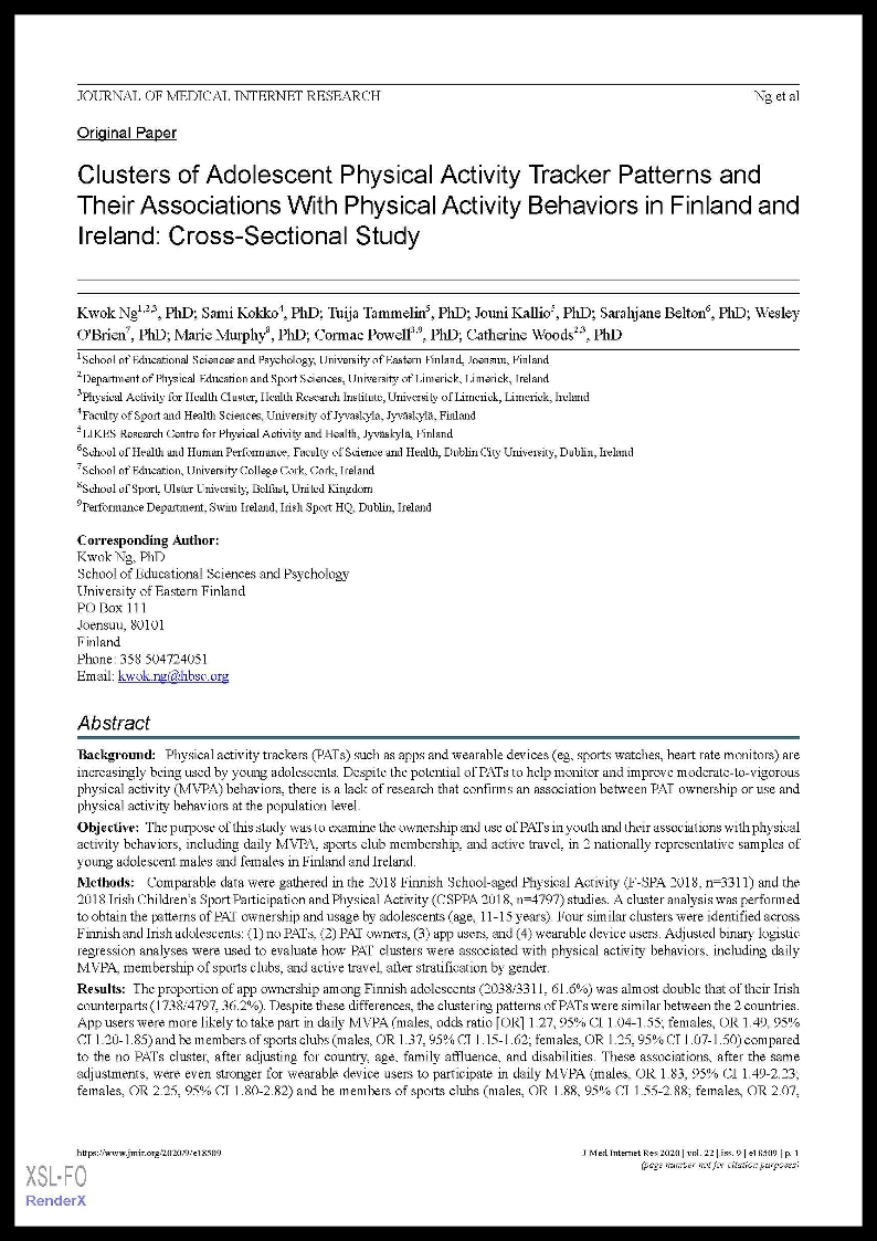 Ng, K., Kokko, S., Tammelin, T., Kallio, J., Belton, S., O’Brien, W., Murphy, M., Powell, C. and Woods, C., 2020. Clusters of Adolescent Physical Activity Tracker Patterns and Their Associations With Physical Activity Behaviors in Finland and Ireland: Cross-Sectional Study. Journal of Medical Internet Research, 22(9), p.e18509. DOI: 10.2196/18509