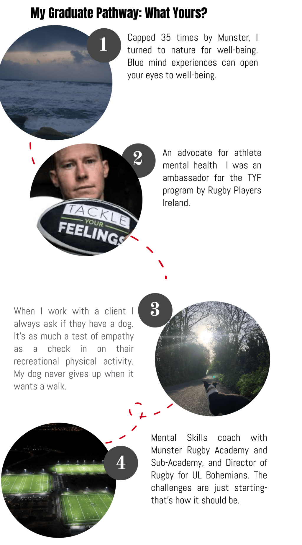 Injuries are very much a part of the game in professional rugby, and I took my fair share of them during my career. After recurring injuries leading to what is termed a ‘non-normative transition’ – those interested in this work see the review by PESS Adjunct Professor David Lavallee– I retired from Munster rugby in Jan. 2017. My masters dissertation entitled ‘Involuntary career transitions of Irish Professional Rugby Union Players: A qualitative Study’ was kind of like studying myself. The participants’ challenges clearly echoed my own experiences and this added issues of transference to the interview process. A systematic review by Lavallee et al. (2011) suggests that it takes about a two-year period before you find out what you want to do next from such dramatic transitions and in my case I’m still discovering my career trajectory.
