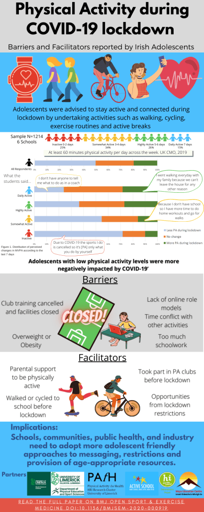 Ng, K., Cooper, J., McHale, F., Clifford, J and Woods, C. Barriers and Facilitators to changes in Physical Activity among Irish Adolescents. BMJ Open Sport and Exercise Medicine. https://doi.org/10.1136/bmjsem-2020-000919