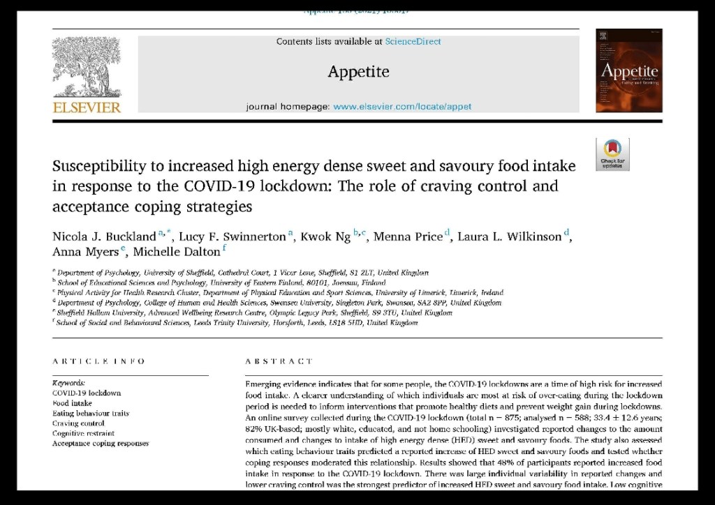 Buckland, N.J., Swinnerton, L.F., Ng, K., Price, M., Wilkinson, L.L., Myers, A., & Dalton. Susceptibility to increased high energy dense sweet and savoury food intake in response to the COVID-19 lockdown: The role of craving control and acceptance coping strategies. Appetite, Volume 158, 1 March 2021. DOI: 10.1016/j.appet.2020.105017