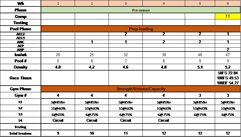 P.S was 6 weeks in duration with a large emphasis placed on S&C combined with a gradual increase in pool loading. Pool volume increased from a low of 20km (week 1) to a high of 47km (week 6), there was a corresponding increase in the frequency of sessions to account for the volume. S&C sessions were at a maximum frequency of 4/wk. for the first 4 weeks with a view to capitalising on the lower pool volume. Once the athlete hit a total of 12 sessions/wk the S&C focus decreased allowing for more of an emphasis to be placed on the growing pool volume.