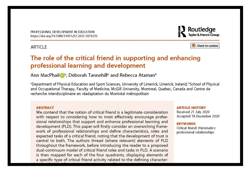 MacPhail, A., Tannehill, D. & Ataman, R. (2021): The role of the critical friend in supporting and enhancing professional learning and development, Professional Development in Education, DOI: 10.1080/19415257.2021.1879235