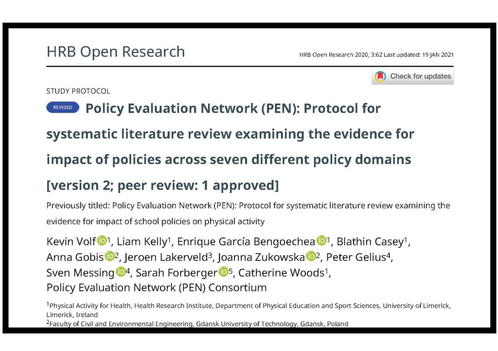 Volf, K., Kelly, L., García Bengoechea, E., Casey, B., Gobis, A., Lakerveld, J., Zukowska, J., Gelius, P., Messing, S., Forberger, S. and Woods, C., 2020. Policy Evaluation Network (PEN): Protocol for systematic literature review examining the evidence for impact of policies across seven different policy domains. HRB Open Research, 3, p.62.