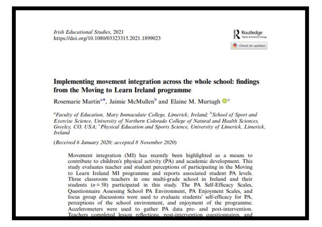 Martin, R., McMullen, J. and Murtagh, E.M., 2021. Implementing movement integration across the whole school: findings from the Moving to Learn Ireland programme. Irish Educational Studies, pp.1-20. DOI: 10.1080/03323315.2021.1899023