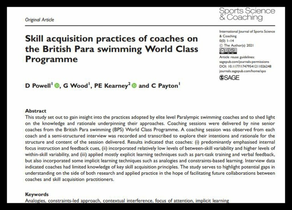 Powell, D., Wood, G., Kearney, P., & Payton, C. (2021). Skill acquisition practices of coaches on the British Para swimming World Class Programme. International Journal of Sports Science & Coaching. Available at: https://journals.sagepub.com/doi/full/10.1177/17479541211026248